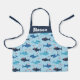 Cute funny sharks with pirate hats and little red fish on blue background with name