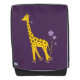 Funny giraffe backpack with a cartoon giraffe nibbling on a light purple flower and holding some flowers with its tail while roller skating, on dark purple background. This cute giraffe design will appeal to girls who love giraffes and cute cartoon illustrations, as well as the purple colour. It will make a great gift for a skater girl, too.