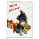 On the front of this Holiday card, an adorable German Shepherd puppy has been caught red-pawed stealing his Christmas stocking full of goodies. Beside him are two brightly wrapped gift packages. The image is placed on a white background with gold confetti, and the red text at the top says "Merry Christmas". Inside are two text fields in red and grey for you to customise.