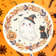 This charming Halloween sticker features a sweet ghost in a witch hat, a smiling black cat, and a carved pumpkin surrounded by an autumn wreath of warm fall leaves. The soft pastel tones and whimsical style make it perfect for decorating treat bags, party favours, or festive crafts. A delightful way to share Halloween cheer with friends, family, or party guests!