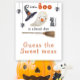 Featuring cute watercolor of baby ghost and Halloween aesthetics. A little boo is almost due! Halloween themed baby shower with watercolor ghost, black cat, witch's hat, magic mop ( broomstick ), spider hanging from a web. The little ghost is eating a lollipop.