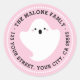 Halloween return address labels featuring a cute little ghost on a pink background. Template fields for your family name and return address.