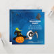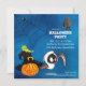 Halloween invitation features a spider web with spider, a cute bat, a reaper ghost, a jack-o-lantern in a witch's hat with a lizard.