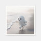 A whimsical white ghost joyfully running along the ocean beach, leaving playful footprints in the soft, sandy beach