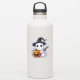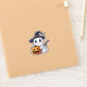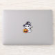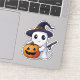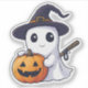 A kawaii ghost dressed as a witch with a broom holds a grinning jack-o-lantern. This cute sticker is a fun way to celebrate Halloween.