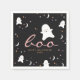 Cute halloween black paper napkin featuring silly funny ghosts, "boo" text in pink, and sprinkles of silver moons and colorful stars. Personalize with short greeting message and/or year. Great for Halloween themed party decoration.