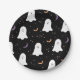 Cute ghosts Halloween paper plate in black background with scattered orange bats, purple moons and stars. Perfect for Halloween themed party decoration.