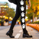 Bring playful spookiness to every outfit! These black leggings feature a row of five adorable ghosts along the side, each with a different cute expression and little arms raised, trying their best to be spooky. Perfect for anyone who loves fun, whimsical Halloween style.
