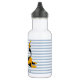 NewParkLane - Here comes trouble! Cute Kids' Water Bottle, with a sweet sleeping cat cartoon in orange and blue and a little bird on its tail, against a soft blue striped background, and a text template for your name or other personal message.