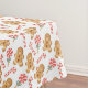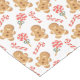This fun Christmas table cloth has a pattern of gingerbread man cookie images, red and white candy canes, and stick candies. The images are placed on a white background. Appealing to kids of all ages for the Holiday season!