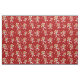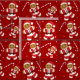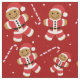 Christmas fabric featuring gingerbread man cookies in Santa outfits. Th smiling Xmas cookie illustrations are in a pattern with candy canes and snow. The fabric has an overall red and white colour scheme and is ready for your holiday project.