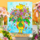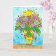 A cute cartoon giraffe is holding a huge bouquet of various flowers and smiling at the viewer. A cute, wholesome card to put a smile on whoever receives it.