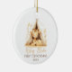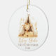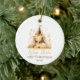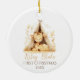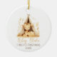 Cute and gender-neutral baby girl or boy's first Christmas ceramic ornament with a giraffe illustration in cream colours. Personalised with the baby's name and the year. Double-sided design. Ideal newborn keepsake for the Holidays.