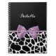 A cute black and white giraffe print notebook with a girly lavender purple ribbon tied into a feminine bow. Personalise this pretty animal print design by adding your name. Flat printed image, not actual bow.