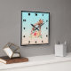 A clock with a cute drawing in watercolors of a mom and baby giraffe. The mother giraffe is resting her head on top of the baby giraffe, loving and adorable. Pretty pink, yellow, green watercolor flower bouquet placed underneath this darling pair. A gradient background created with a delicate turquoise blue color blending into a sandy brown color.