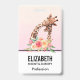 Name badge with a cute drawing in watercolors of a mum and baby giraffe. The mother giraffe is resting her head on top of the baby giraffe, loving and adorable. Pretty pink, yellow, green watercolor flower bouquet placed underneath this darling pair. A gradient background created using a soft pink colour blending into light peachy orange colour.