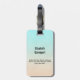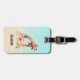 A luggage tag with a cute drawing in watercolors of a mum and baby giraffe. The mother giraffe is resting her head on top of the baby giraffe, loving and adorable. Pretty pink, yellow, green watercolor flower bouquet placed underneath this darling pair. A gradient background created with a delicate turquoise blue colour blending into a sandy brown colour.
