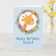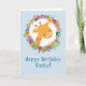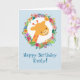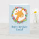 A personalised birthday greeting card with an illustration of a cute giraffe face, surrounded by a wreath of tropical watercolor flowers. Colourful and cute. Message inside the card can be changed or left as is.