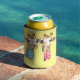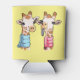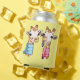 Hand-drawn can cooler design featuring an image of two giraffes from the neck up with white fur and brown splotch markings, wearing scarves (blue scarf on left giraffe and pink scarf on right giraffe), and one giraffe sticking its tongue out. Printed on a light yellow background or the colour of your choice.