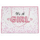 The words, it's a girl, pop against a white background and appears to be three dimensional. There are two small hearts on either side of the word girl and pretty scattered pink glitter around it which appears to sparkle and shine. These are ideal for drive-by, virtual and normal baby shower or newborn events for little girls.