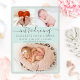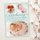 Baby Girl Aqua Teal Birth Announcement 3 Photo Collage Cards. Elegant birth announcement featuring 3 of your favourite baby photos on front, with a pretty hand lettered text „introducing” in a swirly calligraphy script with swash-tails font on light pastel aqua teal or mint green colour background. Add your baby's name on the front and birth stats. At the back side one vertical baby photo on white dots light aqua background. You can easily personalise it.