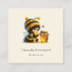 Square business card with a cute image. A girl in a crocheted bee costume with a bee by her side. Watching over a jar of honey.