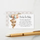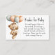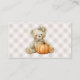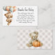 A sweet "books for baby" enclosure card to add with your baby shower invitations. Each guest brings book for baby to the shower instead of a card. The book can be new or gently used, making a nice start to the building of a little library for baby. This feminine design has a cute baby girl teddy bear with bow in her hair carrying a bunch of balloons. The back of the card has the bear sitting with an autumn pumpkin on a neutral beige gingham check background.