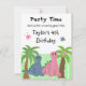 A sweet dinosaur invitation for little girls. A pink and green dinosaur beside palm trees and accented by little butterflies floating around. Customise with all your party information as desired.