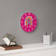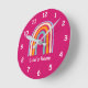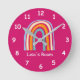 Cute girl's room wall clock with rainbow drawing. Personalise with custom name or quote. Custom background colour i.e. pink. Trendy room decor ideas for children's room or baby nursery. Girly design.