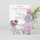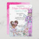 This glamourous and festive custom Christmas party invitation features a cute doll and nutcracker theme. An image of a cute ballet princess doll with brown hair and a rainbow tutu is featured in the bottom left. She has a sparkly diamond crown and is holding an ornament. The Mouse King and Queen are standing to the side of the ballerina doll. A large image of the Nutcracker is standing to the right, in front of a glittery pink Christmas tree. Sprinkles of faux glitter add glam to the illustrations. The title "Winter Wonderland" is printed at the top in an elegant pink script font. "Christmas Party" is printed below in a beautiful teal colour.