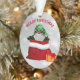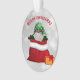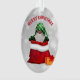 An adorable little white bearded gnome wearing a green and white snowflake Santa hat pops out of a red gift bag on the front of this Christmas ornament. The text above the image says "MERRY CHRISTMAS" in red. The image and text are placed on a silver abstract bokeh background. The back of the ornament has the same background, with an image of Holiday tree bulbs and ribbon, and several text fields for you to customise. This makes a great keepsake gift ornament for a daughter, son, or grandchild.