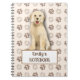 Notebook with charming Golden Retriever. This adorable design showcases cute sitting Golden Retriever puppy. Against a backdrop of dog footprints. Bone like text and customisable name.