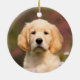 Golden Retriever puppy in a meadow of Cuckoo Flower. He is such a cutie Goldie, I had a lot of fun taking pictures of him. Golden Retrievers are very smart and loyal dogs. This ceramic round Christmas ornament is a gift idea for dog lovers. The puppy-eyed doggy was photographed by Katho Menden