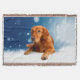 Cute Golden Retriever Dog Sitting Snow Stars Blue Throw Blanket