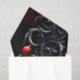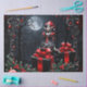 Cute Gothic Christmas Elf. At the centre of this magical setting stands a pointy-eared elf, her eyes sparkling in the light of the full moon like stars on a clear night. Her black and red dress gently sways around her slender frame, giving her an aura of elegance and mystery. The surroundings are adorned with ornate black and red Christmas decorations that seem like forgotten relics from another time. They frame the scene, giving it a gothic festivity that is both enchanting and eerie.