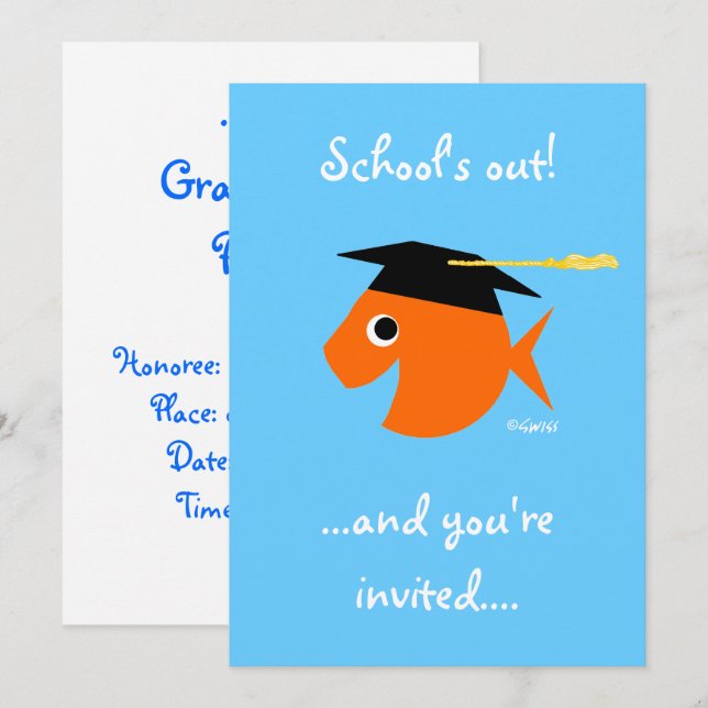 Cute Graduation Beach or Pool Party Turquoise Colour invitations feature a cute smiling goldfish in a graduation cap with flowing tassel who is happy to finally be out of school! It works well for non-aquatic grad parties, too. Change font style, font colour, or background if desired. If you'd like a different colour cap and/or tassel on orders of 25 or more, please message me and I can do that for you. See this cute fish grad on graduation invites with different colour backgrounds, also available in my Zazzle shop.