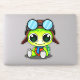 A vinyl decal with a cute chibi cartoon illustration. A green baby turtle wearing a blue scarf and brown aviator hat with goggles. Big wide kawaii eyes and an adorable smile.