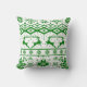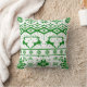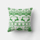 Cute green Christmas knitted reindeer and snowflakes over white background. Customisable throw pillow template