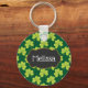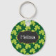 A personalized keychain with a cute repeating pattern of olive green clovers on a dark green background. A fancy vintage frame layered over top with your text inside. Frame has a faux gold foil border.