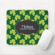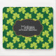 A mousepad with a cute repeating pattern with olive green clovers on a dark green background. A fancy vintage frame layered over top with your text inside. Frame has a faux gold foil border.