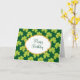 A birthday greeting card with a cute repeating pattern with olive green clovers on a dark green background. A fancy vintage frame layered over top with "Happy Birthday" written inside. Frame has a faux gold foil border.
