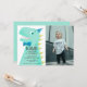 Cute birthday invitation for your child's dinosaur theme party! Cartoon style illustration of a green dinosaur with yellow spikes. The t rex is wearing a blue bow tie and a tiny party hat. You can add the party information on the dinosaur's body. Next to the illustration is where you can add your child's photo. Text and photo is easily editable online.