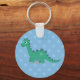 Happy blue green dinosaur animal, cute cartoon dino, keychain for boys, blue dots background.