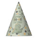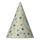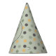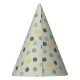 Top your birthday party off with these cute personalised party hats. They feature an adorable illustration of a baby dinosaur in light sage green and yellow with your own dino-mite message above all set against a background of green, yellow and grey polka dots.