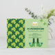 St. Patrick's day party invitation with a pattern composed of clovers. 2 foamy beer mugs and a bunting banner. A pair of legs with shoes in green plaid and shamrock stockings.