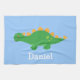 A kitchen towel with a cute green Stegosaurus dinosaur that has yellow spikes for armour. Great for kids who love prehistoric, Jurassic or dinosaur themes. Personalise with child's name or message.