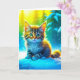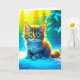 Cute grey kitten playing in the snow on Christmas morning greeting card.