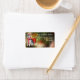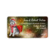 Cute, grey dog in red-white scarf sitting in front of a red gift box, staring at the snowfall in the light, unique, custom winter theme address label with a tranquil, serene, festive feeling.