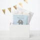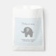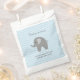 Cute grey elephant baby shower paper favour bags. Personalised party supplies for girls or boys babyshower. Add your own name and thank you for coming message. Elegant grey script typography template. Blue zigzag or custom colour chevron print background. Zig zag pattern design. Hand out sweets and cakes for guests.