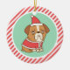 An ornament with a cute but grumpy looking bulldog in a Santa Claus outfit with a candy stripes border. An amusing Christmas doodle for the Christmas tree.